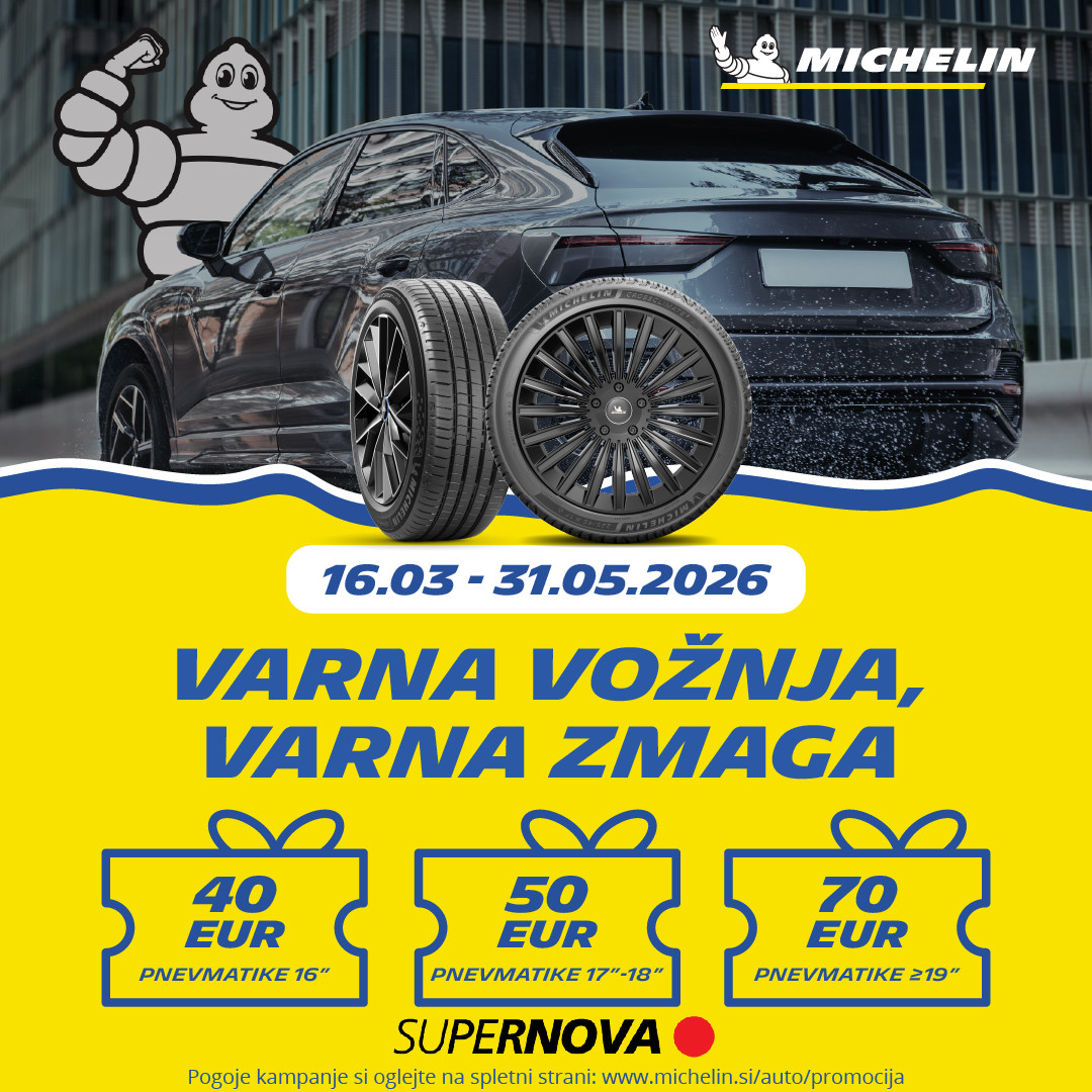 Akcija velja od 16. marca do 31. maja 2026, ob nakupu 4 letnih ali celoletnih pnevmatik na istem računu. Kupone Supernova zagotavlja Michelin po uspešni spletni registraciji; vrednost kupona se določi glede na premer platišča, in sicer: 40 € za 16-palčna platišča, 50 € za 17 in 18-palčna platišča ter 70 € za 19-palčna in večja platišča.